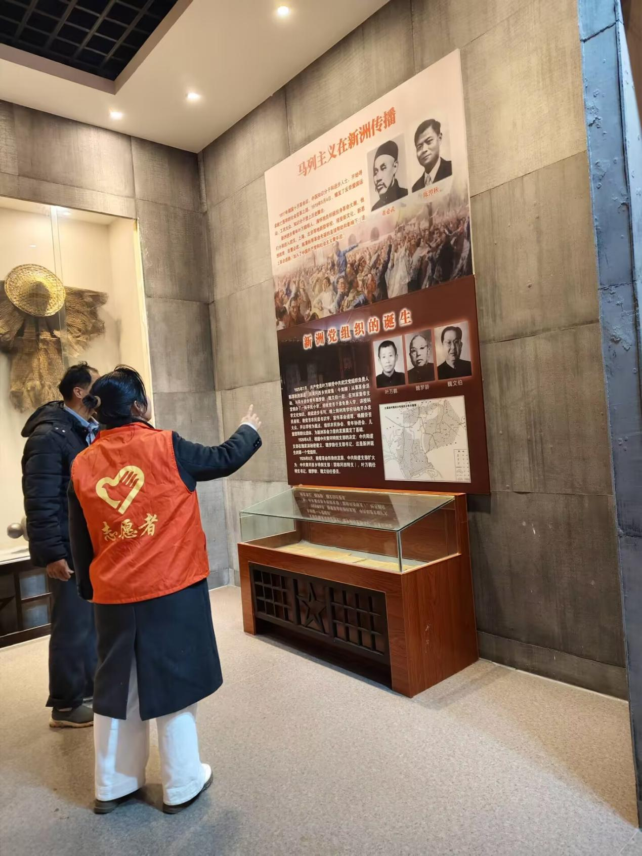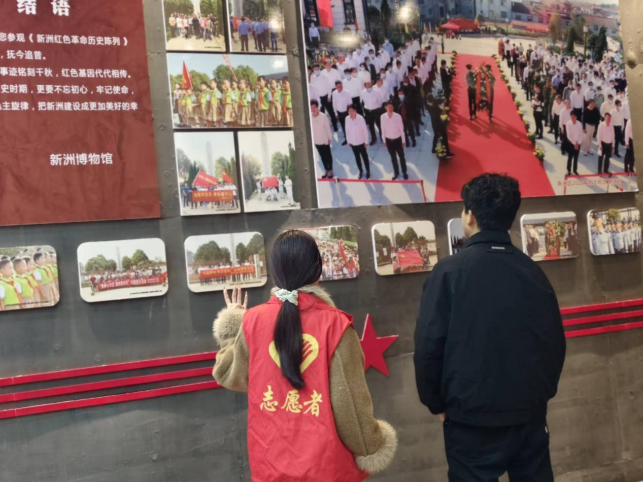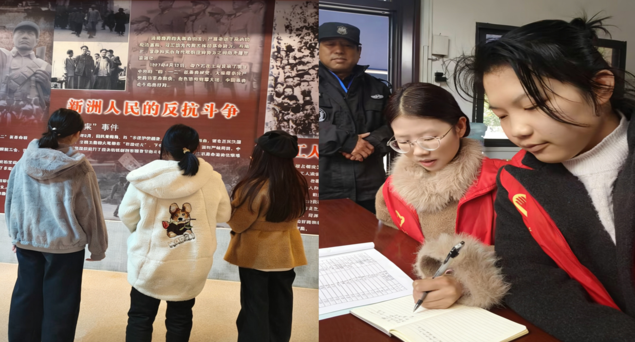 实践初期,在肖琦老师的指导下,团队围绕新洲地区红色历史与志愿服务展开专题研讨,明确实践方向与分工。王子豪同学主动承担前期资料收集与整理工作,他系统查阅党史文献、地方志资料及相关研究成果,梳理出清晰的历史脉络,为实践活动奠定了坚实的理论基础。随后,团队前往新洲区博物馆,沉浸式参观红色革命历史展陈。在工作人员的细致引导下,靖子瑶、陈冰冰同学认真参观与领悟,通过一件件珍贵文物、一幅幅历史图片、一段段详实史料,深入了解革命先辈在新洲地区开展革命斗争的光辉历程,深刻体会革命先烈坚定的理想信念和不畏牺牲的奋斗精神。通过沉浸式学习,进一步增强了她们对革命历史的认识,坚定了传承红色基因、赓续精神血脉的信念。