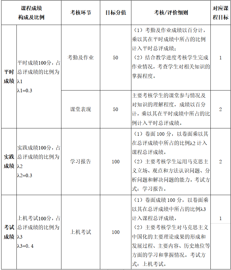 一、课程基本信息 1.课程名称 毛泽东思想和中国特色社会主义理论体系概论 /Introduction to Mao Zedong Thought and the Theoretical System of Socialism with Chinese Characteristics 2.课程代码 15209013 3.课程类别 公共基础课程 4.课程性质 必修 5.学时/学分 40(32+8)/ 2.5 6.先修课程 《思想道德与法治》《中国近现代史纲要》《马克思主义基本原理》等 7.后续课程 《习近平新时代中国特色社会主义思想概论》等 8.适用专业 全校所有本科专业 二、课程的主要任务及目标 1.课程的主要任务 《毛泽东思想和中国特色社会主义理论体系概论》是高校思想政治理论课程中的主要课程,是全校各专业学生的一门必修课。本课程以马克思主义中国化时代化为主线,充分反映中国共产党不断推进马克思主义基本原理同中国具体实际相结合、同中国优秀传统文化相结合的历史进程和基本经验,集中阐释马克思主义中国化时代化理论成果的形成过程、主要内容、精神实质、历史地位和指导意义。 通过本门课程的学习,使大学生对中国共产党领导人民进行的革命、建设、改革的历史进程、历史变革、历史成就有更加全面的了解;对中国共产党坚持把马克思主义基本原理同中国具体实际相结合、同中国优秀传统文化相结合,不断推进马克思主义中国化时代化有更深刻的理解;对马克思主义中国化时代化进程中形成的理论成果有更加准确的把握;对运用马克思主义立场、观点和方法认识问题、分析问题和解决问题的能力有更加明显的提升。 2.课程目标 目标1:了解中国共产党领导人民进行的革命、建设、改革的历史进程、历史变革、历史成就;把握马克思主义中国化时代化进程中形成的理论成果;理解中国共产党坚持把马克思主义基本原理同中国具体实际相结合、同中国优秀传统文化相结合,不断推进马克思主义中国化时代化。 目标2:坚定社会主义和共产主义的理想信念,坚持党的基本理论、基本路线和基本纲领;提升运用马克思主义立场、观点和方法认识问题、分析问题和解决问题的能力;积极投身于中国特色社会主义伟大实践,为实现共产主义伟大事业奋斗终身。 三、课程教学内容与学时分配 序号 知识单元/章节 知识点 教学要求 推荐学时 教学方式 支撑课程目标 1 导论 马克思主义中国化时代化的历史进程与理论成果 1.马克思主义中国化时代化的提出 2.马克思主义中国化时代化的内涵 3.马克思主义中国化时代化的历史进程 4.马克思主义中国化时代化理论成果及其关系 5.学习本课程的要求和方法 1.了解:马克思主义中国化时代化的提出; 2.理解:马克思主义中国化时代化的历史进程; 3.掌握:马克思主义中国化时代化的内涵、理论成果及其关系。 2 讲授讨论 1、2 2 第一章 毛泽东思想及其历史地位 1.毛泽东思想的形成和发展 2.毛泽东思想的主要内容和活的灵魂 3.毛泽东思想的历史地位 1.了解:毛泽东思想形成和发展的历史条件及过程; 2.理解:毛泽东思想的历史地位和指导意义; 3.掌握:毛泽东思想的主要内容和活的灵魂;科学评价毛泽东和毛泽东思想的原则方法。 4 讲授讨论 练习 1、2 3 第二章 新民主主义革命理论 1.新民主主义革命理论形成的依据 2.新民主主义革命的总路线和基本纲领 3.新民主主义革命的道路和基本经验 1.了解:近代中国国情和中国革命的时代特征; 2.理解:新民主主义革命理论的实践基础,新民主主义革命的总路线和基本纲领; 3.掌握:新民主主义革命的道路、革命的三大法宝、革命理论的重要意义。 4 讲授讨论 练习 1、2 4 第三章 社会主义改造理论 1.从新民主主义到社会主义的转变 2.社会主义改造道路和历史经验 3.社会主义基本制度在中国的确立 1.了解:新民主主义社会的性质和党在过渡时期总路线的内容及其依据; 2.理解:适合中国特点的社会主义改造道路和历史经验; 3.掌握:确立社会主义基本制度的重大意义。 4 讲授讨论 练习 1、2 5 第四章 社会主义建设道路初步探索的理论成果 1.初步探索的重要理论成果 2.初步探索的意义和经验教训 1.了解:社会主义建设道路初步探索的经验教训; 2.理解:初步探索的意义; 3.掌握:初步探索的重要理论成果。 2 讲授讨论 练习 1、2 6 第五章 中国特色社会主义理论体系的形成发展 1.中国特色社会主义理论体系形成发展的社会历史条件 2.中国特色社会主义理论体系形成发展过程 1.了解:中国特色社会主义理论体系形成发展的国际背景及历史条件; 2.理解:中国特色社会主义理论体系形成发展的实践基础; 3.掌握:中国特色社会主义理论体系的形成、跨世纪的发展、在新世纪新阶段的新发展及在新时代的新篇章。 4 讲授讨论 练习 1、2 7 第六章 邓小平理论 1.邓小平理论首要的基本的理论问题和精髓 2.邓小平理论的主要内容 3.邓小平理论的历史地位 1.了解:邓小平理论的主要内容; 2.理解:邓小平理论的历史地位; 3.掌握:邓小平理论首要的基本的理论问题和精髓。 4 讲授讨论 练习 1、2 8 第七章 “三个代表”重要思想 1.“三个代表”重要思想的核心观点 2.“三个代表”重要思想的主要内容 3.“三个代表”重要思想的历史地位 1.了解:“三个代表”重要思想主要内容; 2.理解:“三个代表”重要思想的历史地位; 3.掌握:“三个代表”重要思想的核心观点。 4 讲授讨论 练习 1、2 9 第八章 科学发展观 1.科学发展观的科学内涵 2.科学发展观