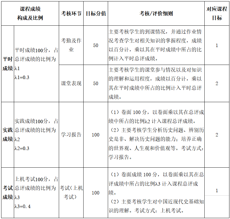 课程目标评价 内容 | 考勤及作业 | 课堂表现 | 学习报告 | 上机考试 | 课程总评成绩 |