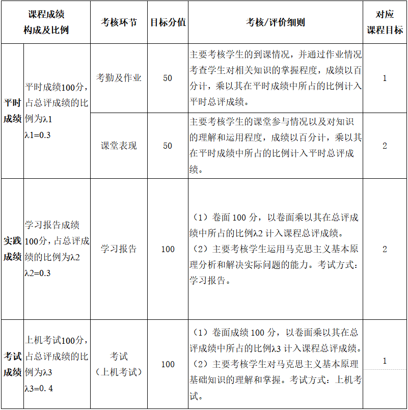 课程目标评价 内容 | 考勤及作业 | 课堂表现 | 学习报告 | 上机考试 | 课程总评成绩 |
