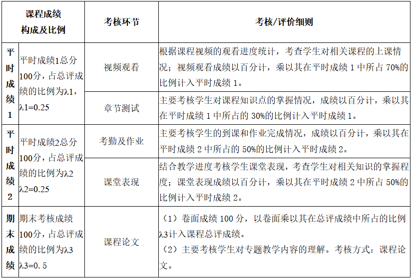 本课程以学年为单位进行成绩核定,考核方式为考查,采用开卷撰写论文的方式。课程的考核以考核学生能力培养目标的达成为主要目的,以检查学生对各知识点的掌握程度和应用能力为主要内容,该课程第1、3、5、7学期的课程名称分别为形势与政策A/B/C/D,第2、4、6、8学期的课程名称分别为形势与政策1/2/3/4。其中,形势与政策1/2/3/4的成绩分别由对应单学期的形势与政策A/B/C/D的成绩(平时成绩1)、当前学期的平时成绩(平时成绩2)以及论文撰写成绩(期末成绩)构成。课程总评成绩由三部分成绩加权而成,对应单学期的成绩(平时成绩1)、当前学期的平时成绩(平时成绩2)以及论文撰写成绩(期末成绩)为百分制,总评成绩为五级制。在总评成绩中,三部分成绩所占的权重分别为l1、l2、l3,其中l1、l2、l3根据学校相关规定分别定为0.25、0.25、0.5。