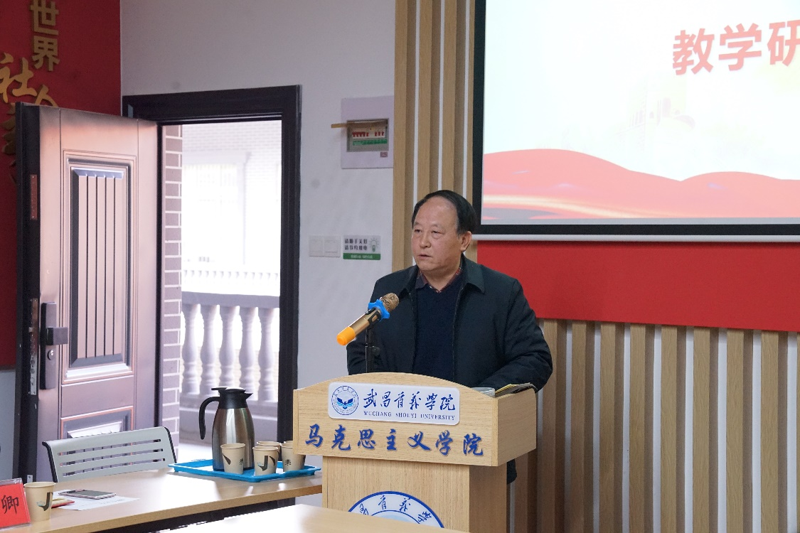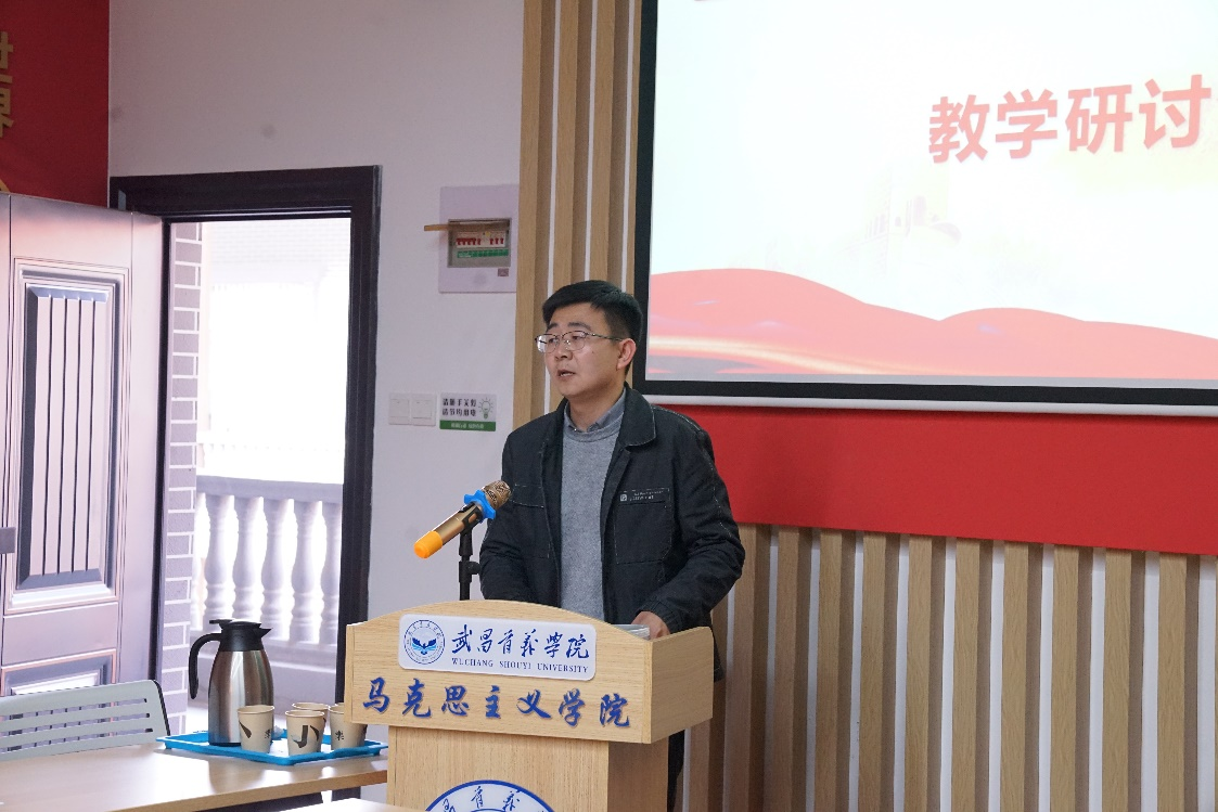 最后,马克思主义学院院长李资源总结了校领导以及各位教学骨干的交流发言,并提出应对今后教学做到三个“下功夫”,第一要在学深悟透新思想上下功夫,准确把握习近平新时代中国特色社会主义思想体系;第二要在集体备课内容上下功夫,突出备好教材、学生、教法,集思广益取长补短并做好学情分析。第三要在创新教学方法上下功夫,把社会实践教学“一课一品”落到实处,将这门课程真正建成高质量的一流本科课程。