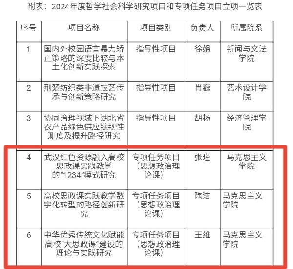 近日,2024年度省教育厅哲学社会科学研究项目和专项任务项目立项名单公示,我院三位教师获批思想政治理论课专项任务项目,分别是:张瑾“武汉红色资源融入高校思政课实践教学的‘1234’模式研究”;陶洁“高校思政课实践教学数字化转型的路径创新研究”;王维“中华优秀传统文化赋能高校‘大思政课’建设的理论与实践研究”。