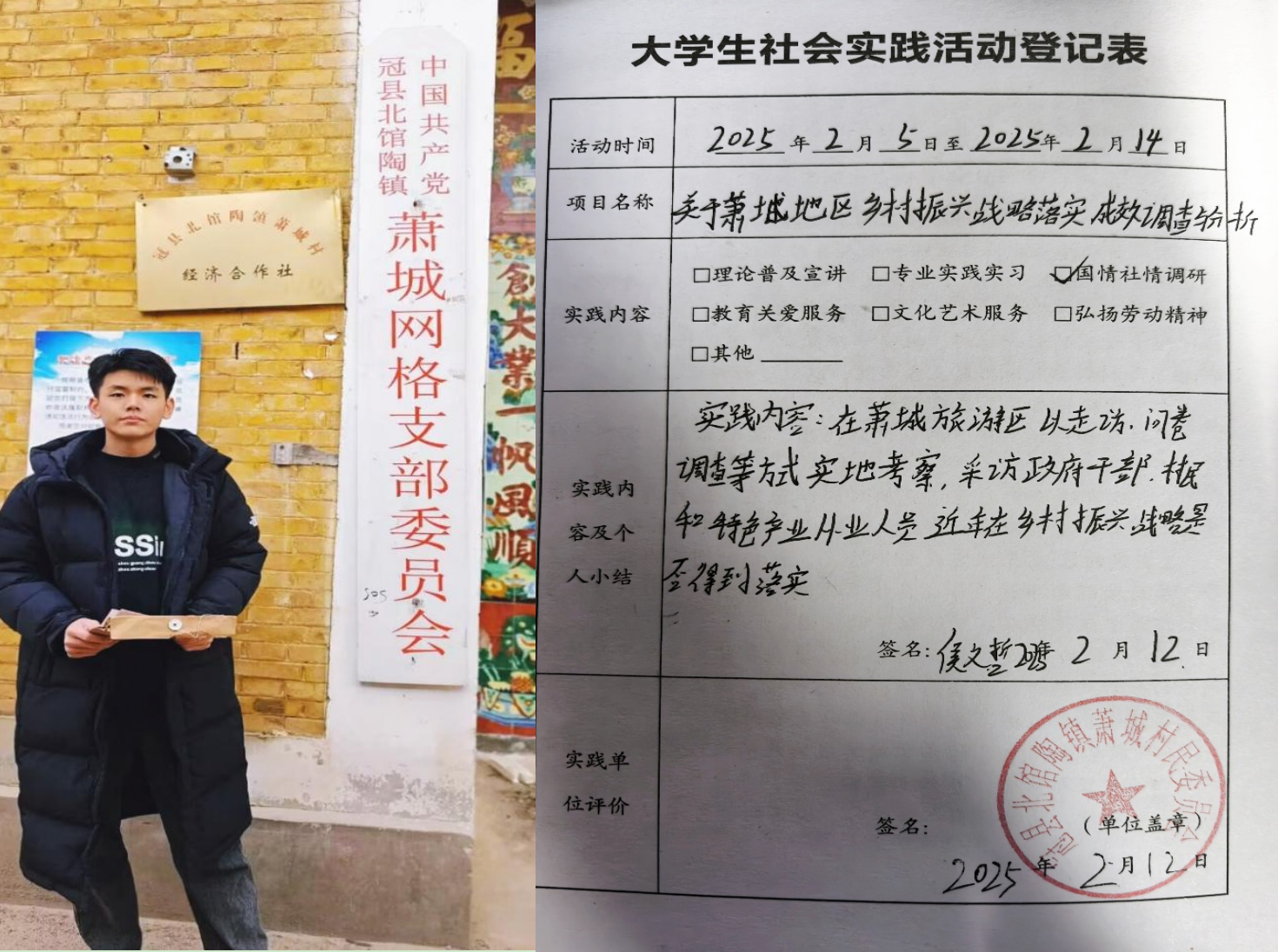 寒假期间,我校信息科学与工程学院学子侯文哲在马克思主义学院教师邹埕鸷的指导下,赴山东省聊城市冠县北馆陶镇东南萧城村开展了为期一周的以 “乡村振兴,青春建功”为主题的社会实践活动。