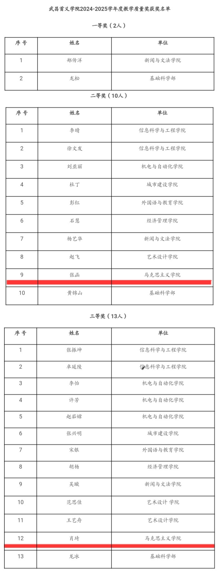 近日,学校正式公布了2024-2025年度教学质量奖获奖名单。我院张函和肖琦两位老师凭借扎实的教学功底、先进的教学理念和优异的育人成果,分别荣获二等奖和三等奖。此次获奖充分彰显了我院教师队伍卓越的教学水平和学院长期以来在教育教学改革方面取得的显著成效。