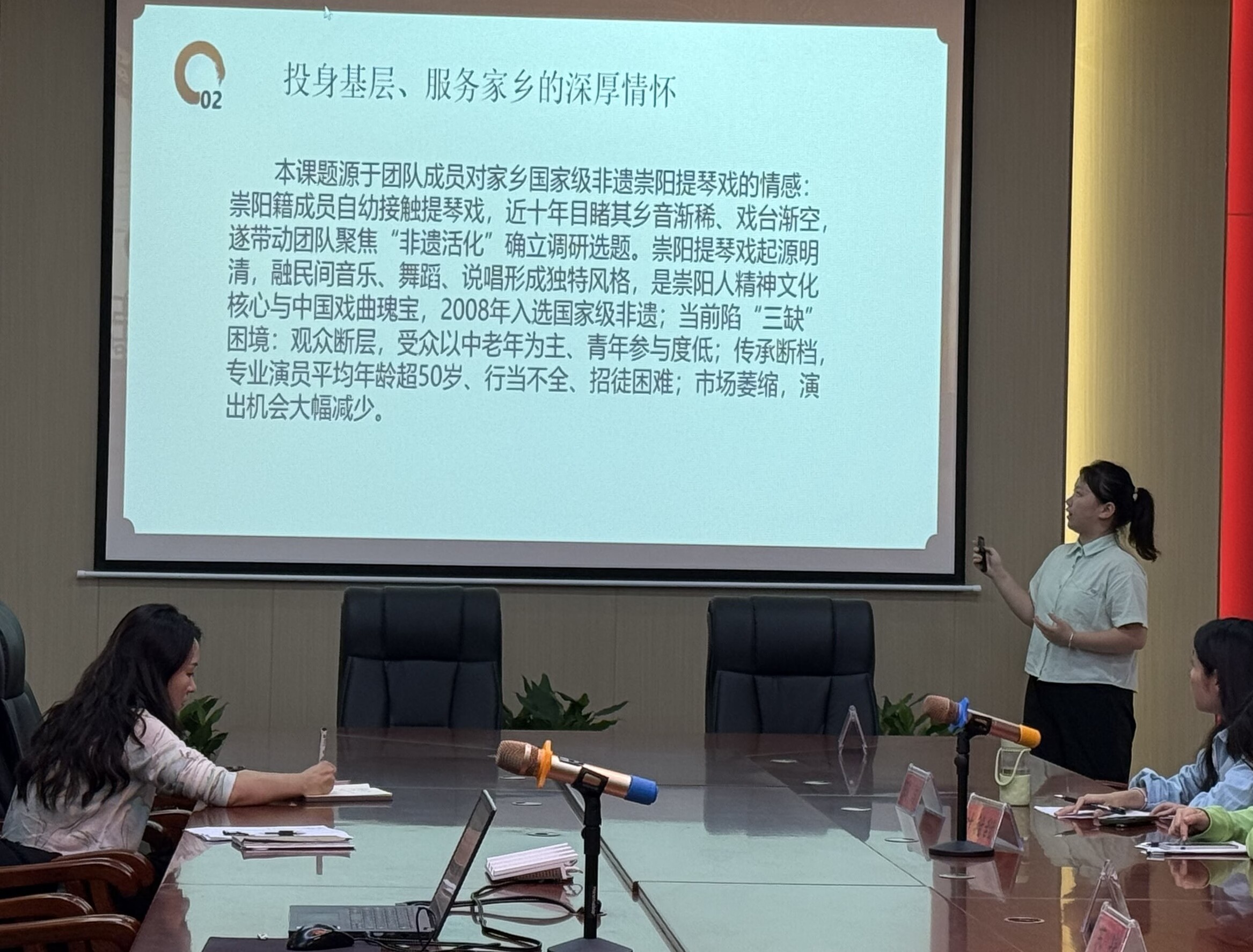 分享环节,“楚韵新声队”实践队跨区域对襄阳及荆门两地历史建筑群和非遗记忆、区域文化生态联合调研,探索传统文化在当代社会的创新表达与可持续传承模式,为中部地区文化资源整合、非遗活态化、青年文化认同提供实证数据与针对性建议,用青春之力探索传统文化在当代社会的创新表达与可持续传承模式。“非遗琴戏新韵探研实践队” 源于对家乡国家级非遗崇阳提琴戏的情感,聚焦“非遗活化”确立调研选题,从文化馆里看崇阳提琴戏、从戏曲基地里看崇阳提琴戏、从问卷里看崇阳提琴戏现状及发展机遇,引发了一场关于地方非遗传承的广泛社会关注,唤起本地居民对提琴戏的文化记忆与自豪感。“松石重访-振兴序章“调研队聚焦松石新交易中心,对比新旧市场差异,探究政策支持、技术赋能、模式创新下的发展成效,为绿松石产业数字化转型深化提供实践依据,助力乡村振兴。计科(华为)2303班黄敬轩走访民营企业,调查其进出口贸易受影响情况及战略调整,深化对国际经济与企业实践的认知,打通理论与现实的链接,引导青年学子把思政小课堂同社会大课堂结合起来,在亲身参与中体悟中国特色社会主义道路自信、理论自信、制度自信、文化自信,为以中国式现代化全面推进中华民族伟大复兴贡献青春智慧。编导2303叶羚聚焦闽南蔡氏漆线雕非遗,分析漆线雕现状与核心问题,提出政校企联动建议、以实践调研驱动文化传承创新,以专业优势赋能非遗文化传播。每一支实践队伍皆独具特色、熠熠生辉。从精准聚焦的实践主题出发,深入剖析其背后的时代意义与社会价值;沿着实践过程的脉络,细腻描绘每一步的探索与尝试,展现团队成员脚踏实地、勇于突破的精神风貌。