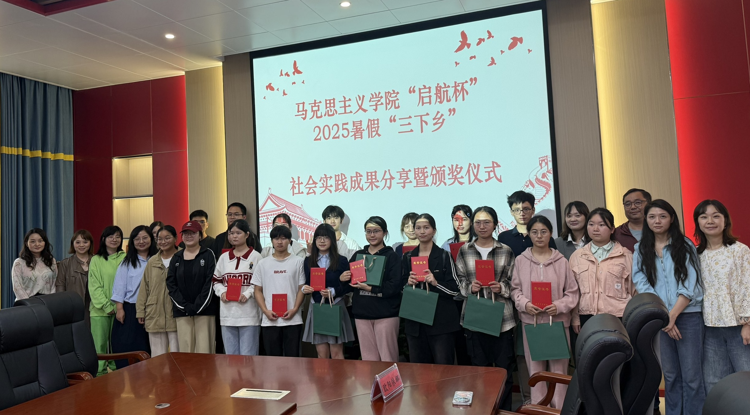 为深入学习宣传贯彻习近平新时代中国特色社会主义思想和习近平总书记考察湖北重要讲话精神,引导和帮助广大青年学生上好“行走的思政课”和“一线的专业课”,9月25日,马克思主义学院“启航杯”2025年暑期“三下乡”社会实践成果分享暨颁奖仪式在学院会议室圆满召开。马克思主义学院副院长张瑾、各教研室主任、副主任及社会实践指导教师参会,会议由形势政策与社会实践教研室副主任黄珊珊主持。