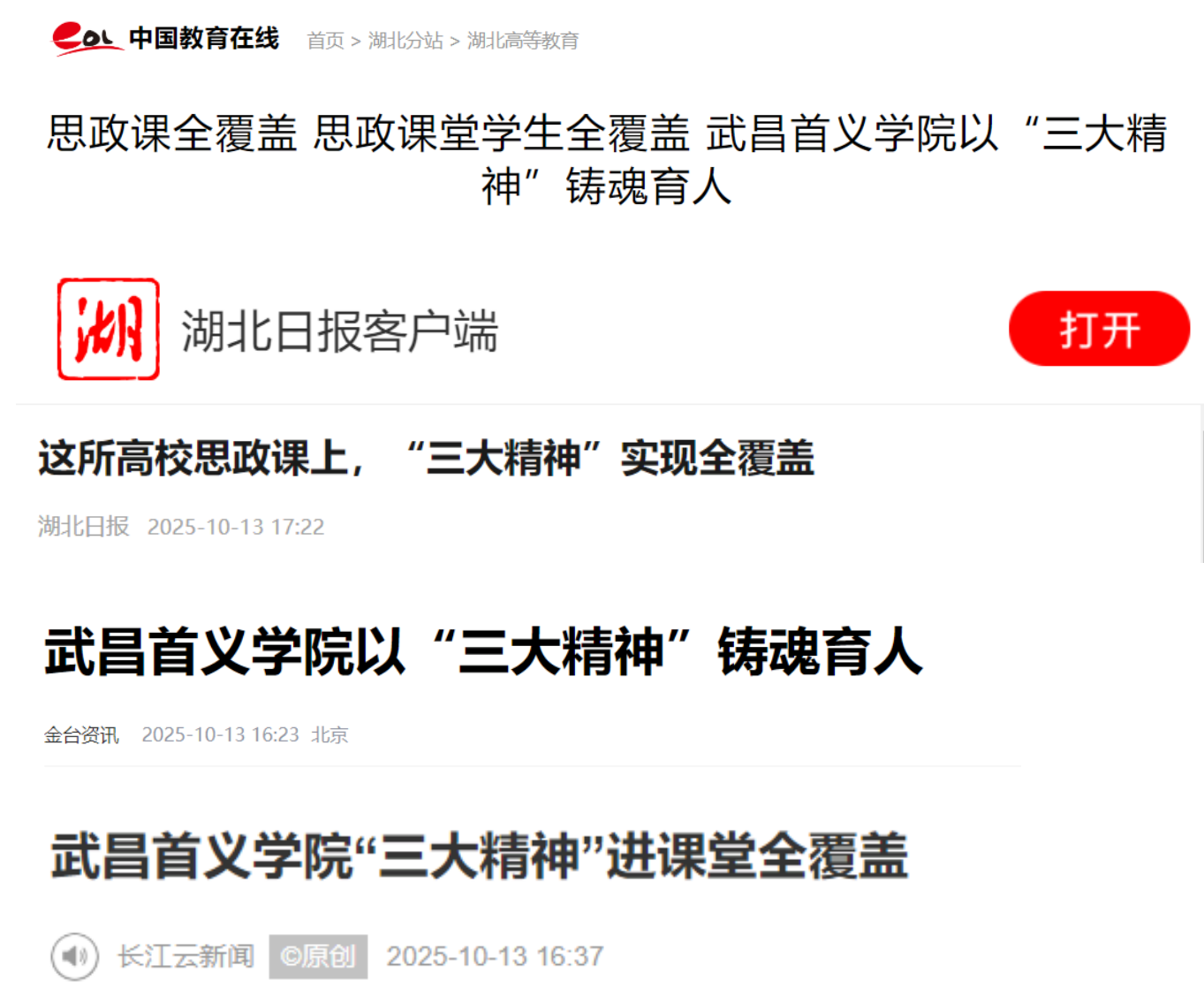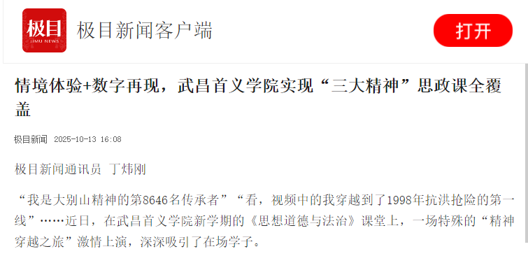 相关教学实践经极目新闻首发后,迅速被中国教育在线、人民网、湖北日报等多家主流媒体转载报道,引发良好社会反响,展现了我校在落实立德树人根本任务、推进思政课改革创新方面的积极探索。