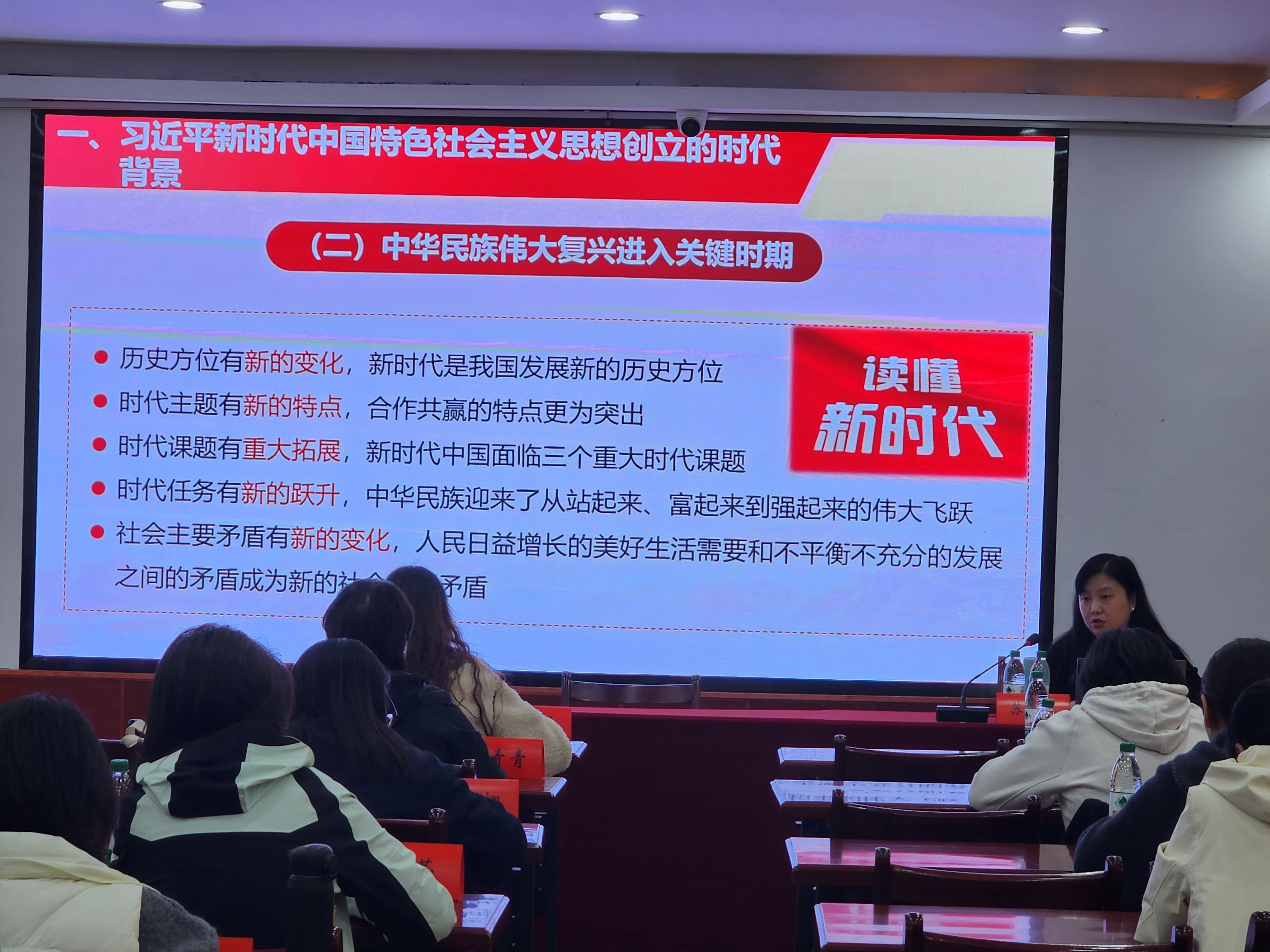 宣讲会上,苏婕老师充分发挥自身理论素养深厚、教学经验丰富的优势,围绕习近平新时代中国特色社会主义思想的核心要义、精神实质、丰富内涵和实践要求进行了系统梳理和深入浅出的讲解。宣讲内容涵盖了习近平新时代中国特色社会主义思想形成的时代背景与重大意义,详细阐释了其作为全党全国人民为实现中华民族伟大复兴而奋斗的行动指南的历史地位;系统解读了“十个明确”、“十四个坚持”等核心内容框架,并结合党的十八大以来,在党的坚强领导下我国经济社会发展取得的历史性成就、发生的历史性变革,生动展现了这一思想强大的真理力量和实践伟力。