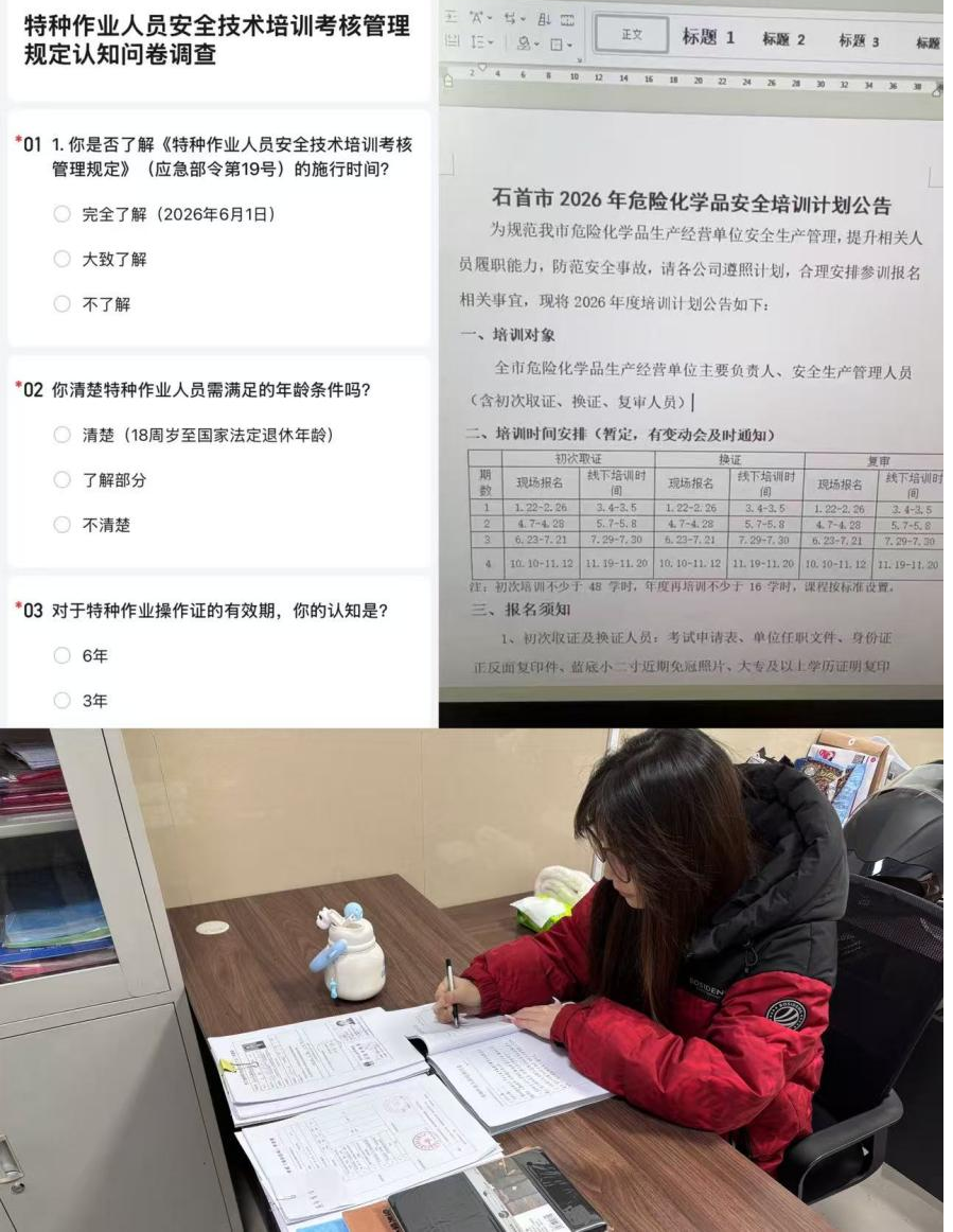 为破解政策传播“最后一公里”难题,她结合法律法规及实际需求,撰写通俗易懂的培训公告,方便各企业年后合理安排参训报名;针对初次取证、换证、复审人员的政策认知盲区,设计针对性强的政策认知问卷,助力从业者快速掌握新政策要点。此外,她严格规范撰写培训日志,详细记录培训内容、参训情况及问题整改过程,确保培训全程可追溯、可核查,为公司优化服务提供了有力支撑。