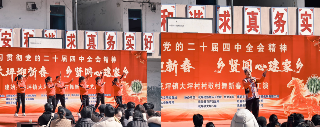 2月2日,大坪村举办“情暖大坪迎新春 乡贤同心建家乡”文艺汇演,以群众喜闻乐见的形式贯彻党的二十届四中全会精神。刘翱翔、葛思涵主动参与汇演筹备与现场服务工作,协助村委会布置场地、组织观众、维护秩序。汇演现场,恩施扬琴、快板说唱等极具地方特色的节目轮番上演,演员们用通俗易懂的语言宣讲党的政策、讲述乡村变化,将“共同富裕”“基层治理”等核心要义融入文艺表演中,让党的创新理论飞入寻常百姓家 。小组成员还在现场为村民解答法律咨询、普及惠民政策,与乡贤代表、村民代表共同探讨乡村发展路径,进一步浓厚了“听党话、感党恩、跟党走”的氛围。
