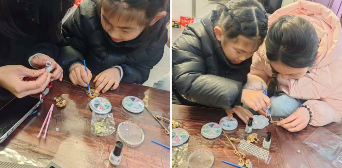 本次活动的核心亮点,是以学生为主导搭建线上线下联动的宣传与体验矩阵,让融合了双“红楼”文化的小众螺钿技艺走出工坊、走进大众,让中华优秀传统文化与红色革命文化可看、可学、可体验。线下,实践队学子化身“非遗宣传员”,在校园、家乡社区、文化广场搭建专属展台,通过图文展板、现场讲解等形式,向师生、市民同步普及螺钿技艺的文化底蕴、《红楼梦》的古典美学价值与首义红楼的红色精神内涵;重点设置简易螺钿镶嵌体验区,学子们手把手指导大家裁剪螺钿、简易镶嵌、基础抛光,耐心细致讲解每一个步骤,让群众在亲手制作双“红楼”主题螺钿作品的过程中,感受传统工艺的精妙,在沉浸式体验中领悟中华传统文化的魅力与红色革命精神的力量。同时,团队设计趣味体验环节,让孩子们在动手制作中接触螺钿技艺、了解双“红楼”文化,播撒文化传承与红色基因的种子,推动传统文化与红色精神代代相传。