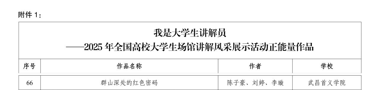近日,由教育部中国大学生在线主办的“我是大学生讲解员 ——2025年全国高校大学生场馆讲解风采展示活动”评选结果揭晓。我校新闻与文法学院2024级学生陈子豪、刘婷、李璇在马克思主义学院张瑾老师指导下创作的《群山深处的红色密码》,成功入选全国100件正能量作品,展现了新时代首义学子的良好风貌。